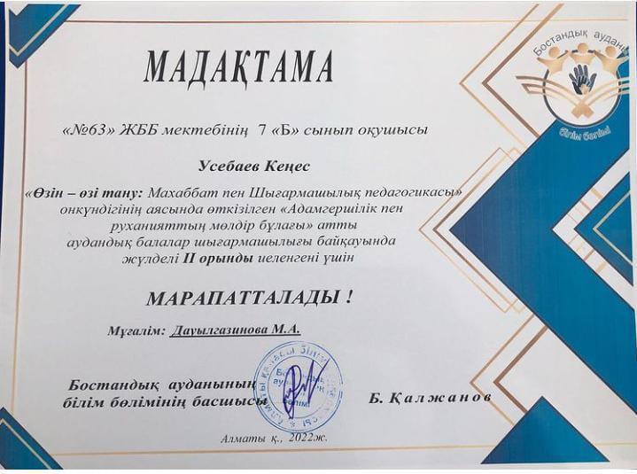 "Өзін-өзі тану" пәні бойынша аудандық "Адамгершілік пен руханияттың мөлдір бұлағы" атты аудандық балалар шығармашылығы байқауында жүлделі орын алған оқушыларымызды шын жүректен құттықтаймыз