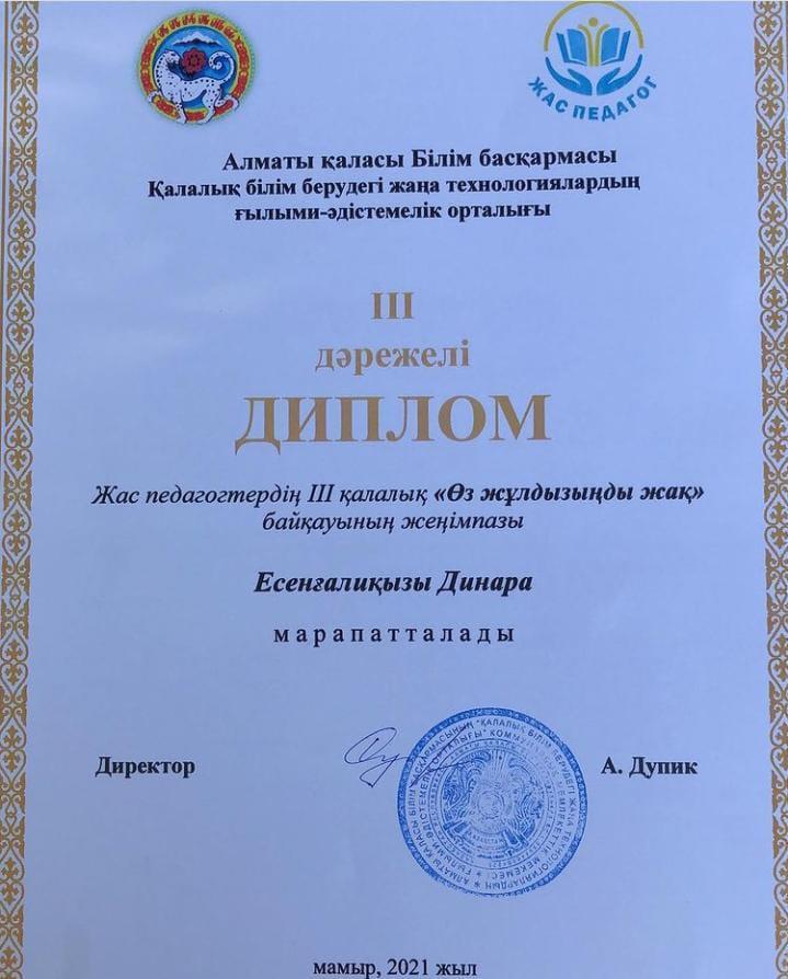 Жаңа оқу жылының басталған сәтінде мектебіміздің жаста болса өз мамандығының шебері-Қазақ тілі мен әдебиеті пәнінің мұғалімі Есенғали Динара жас педагогтардың қалалық байқауынан 3-орын иеленді. Жас мұғалімге оқуда табыс, жеңістер мен биік белестерді бағындыруды тілейміз.